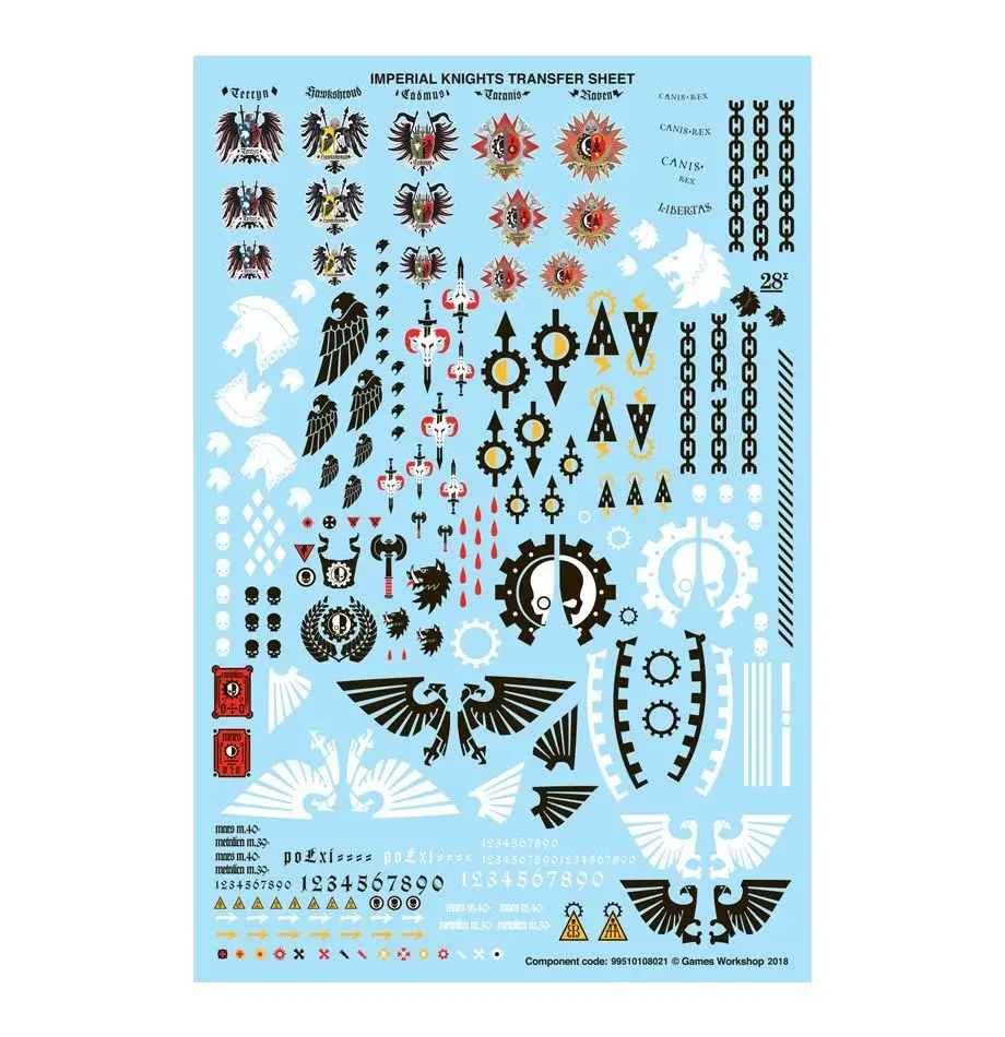 Le Knight Preceptor est fourni en 250 composants, plus un socle ovale Citadel de 170mm, un socle rond Citadel de 25mm pour le pilote à pied, et une planche de décalcomanies comportant de l'héraldique pour Imperial Knights ainsi que celle propre à Canis Rex.