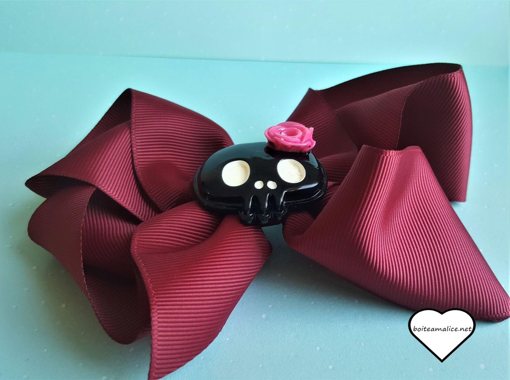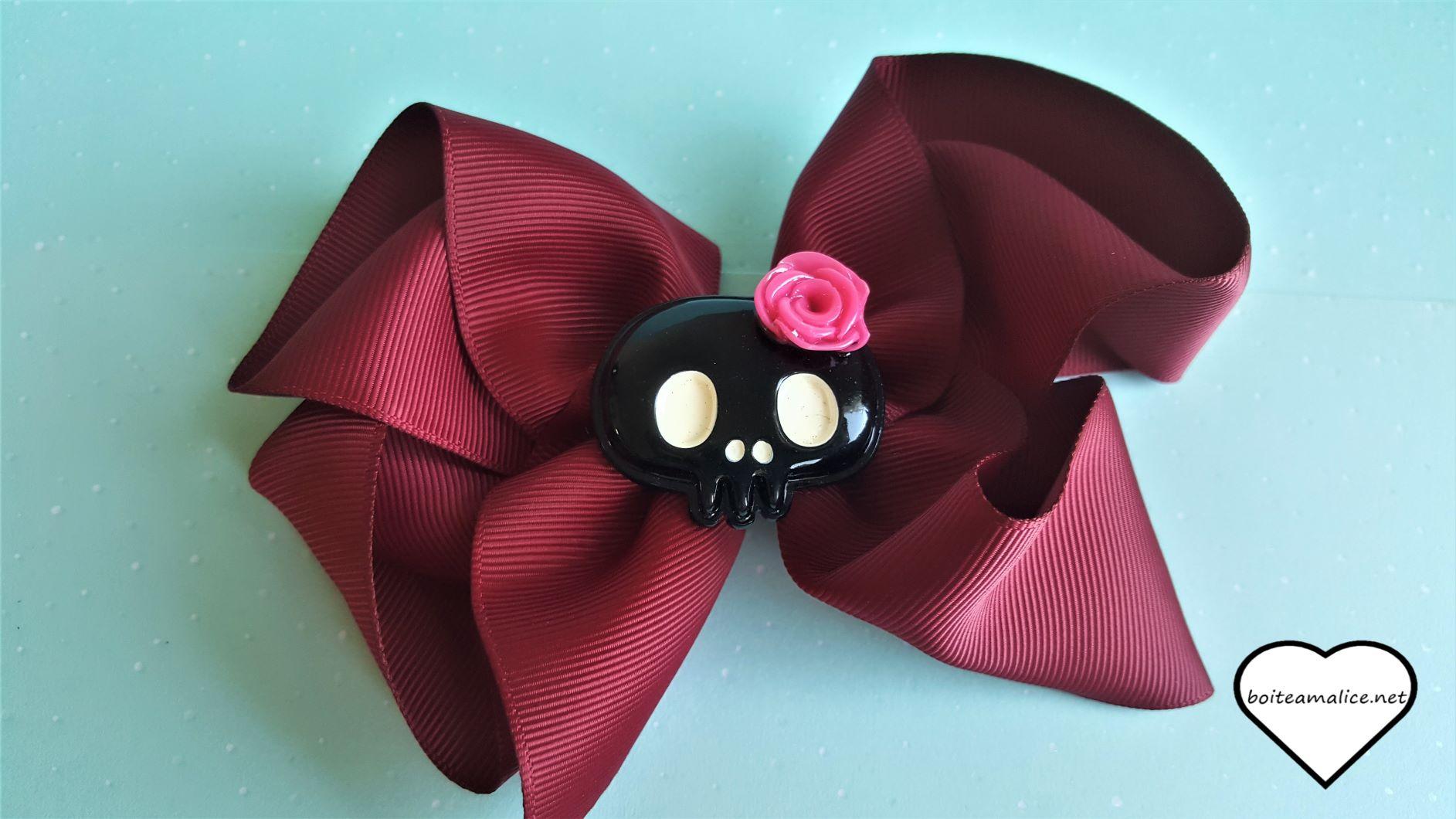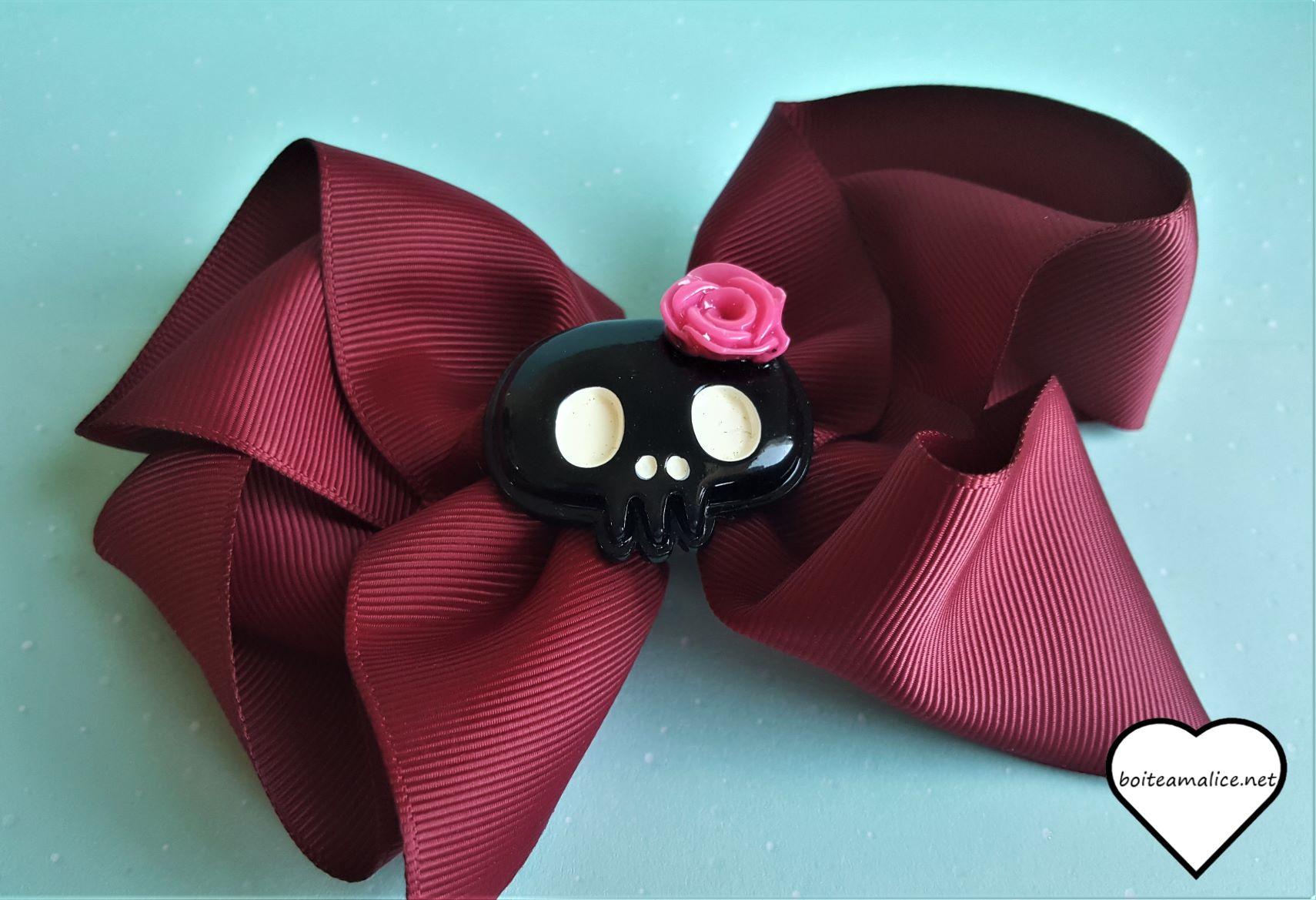 Avec Tête de mort noire ce gros noeud bordeaux fait main par Boîte à Malices mettra un côté rock et gothique dans vos coiffures.