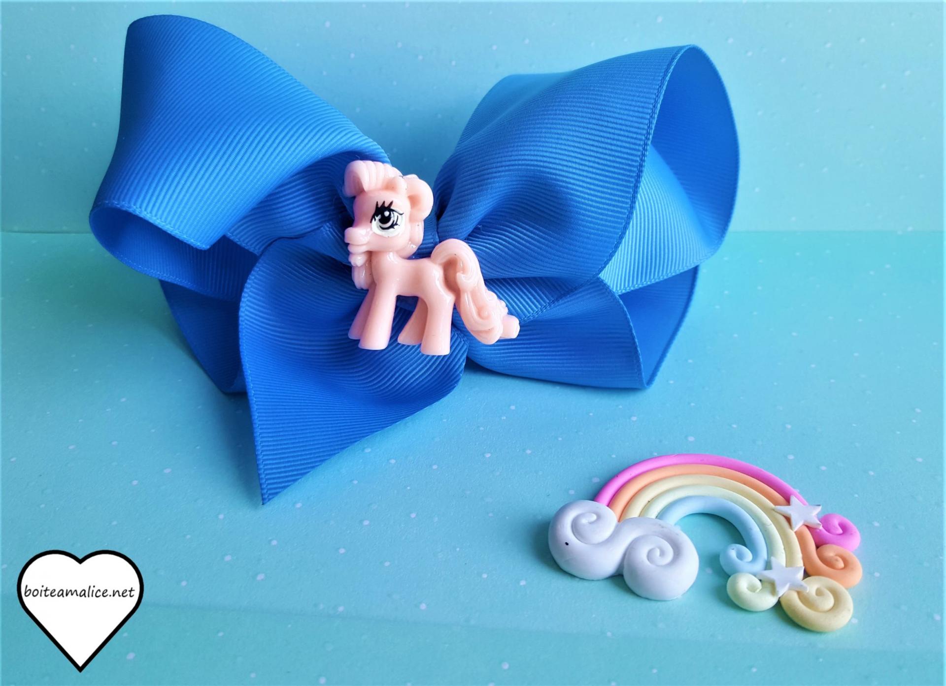 Gros nœud barrette pour cheveux, barrette pince crocodile. Bleu avec breloque poney rose
