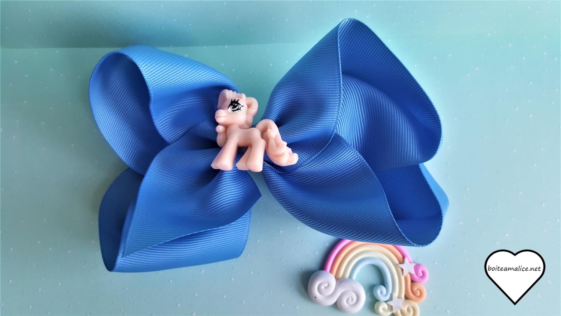 Avec sa breloque Poney rose ce gros noeud bleu fait main par Boîte à Malices va mettre de la magie dans toutes les coiffures. Idéal pour les filles un peu rêveuse.