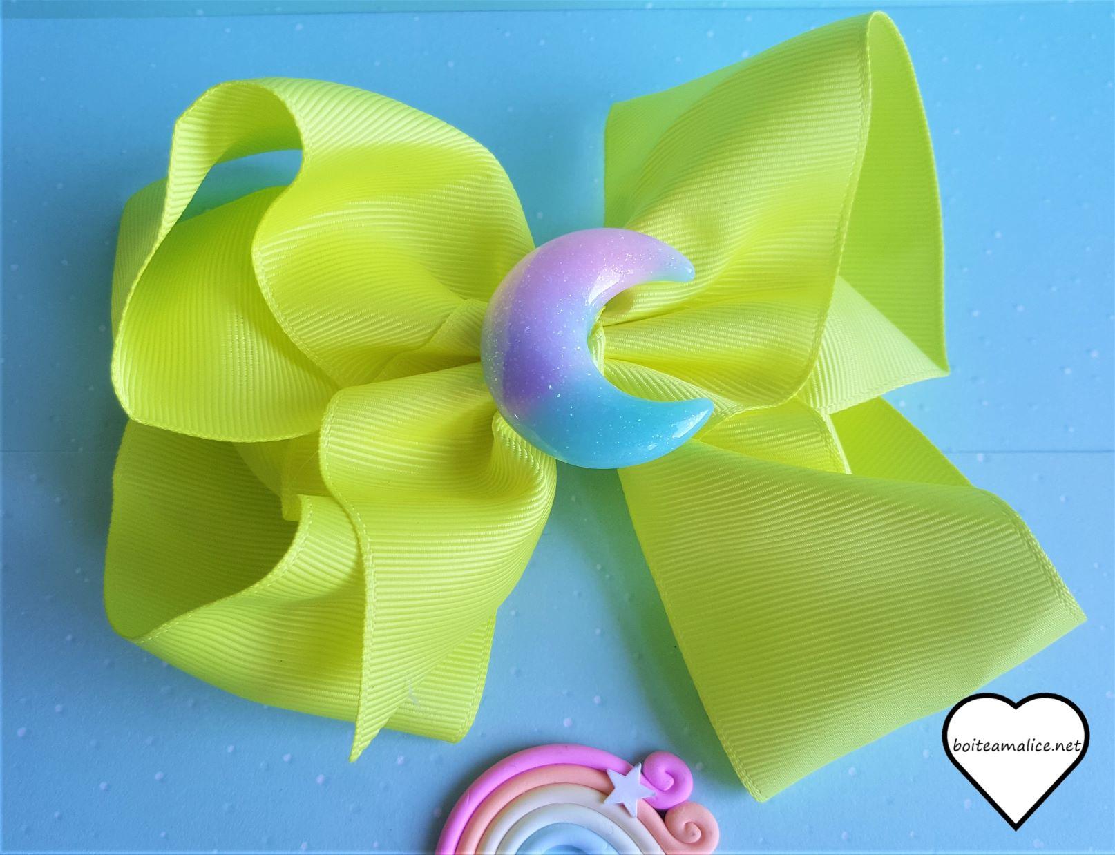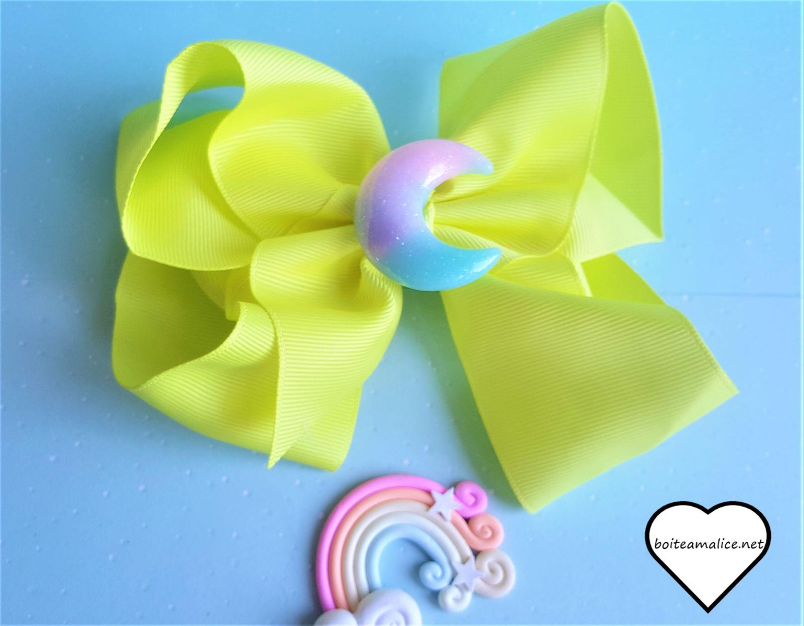 Pour celles qui ont la tête dans les étoiles et qui aiment les couleurs acidulées. Si toi aussi tu aimes être à la mode et porter ces gros noeuds dans les cheveux alors ce joli noeud à la couleur vive avec sa breloque lune en résine est fait pour toi. Faite main par Boîte à Malices elle va mettre de la magie dans toutes vos coiffures.