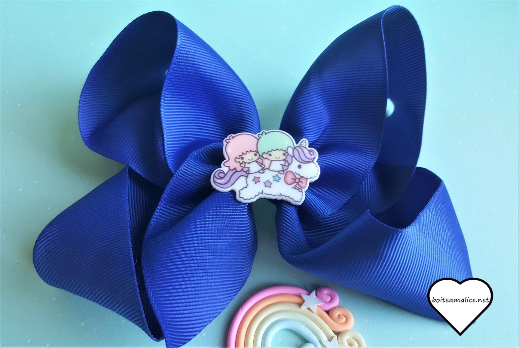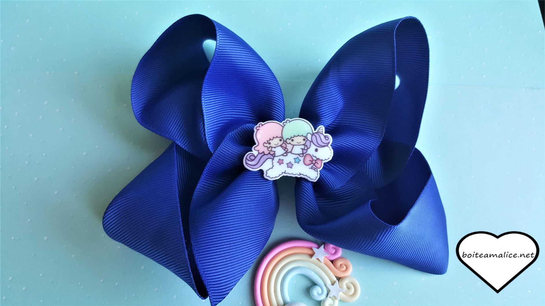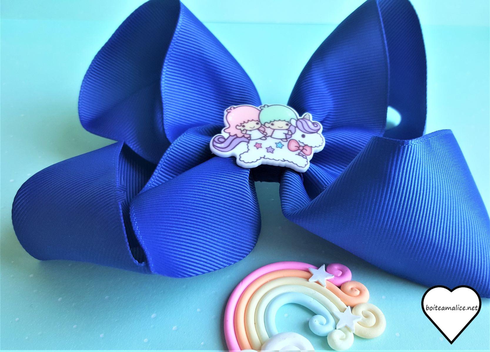 Barrette gros noeud Bleu nuit et petit personnage trop kawaii.