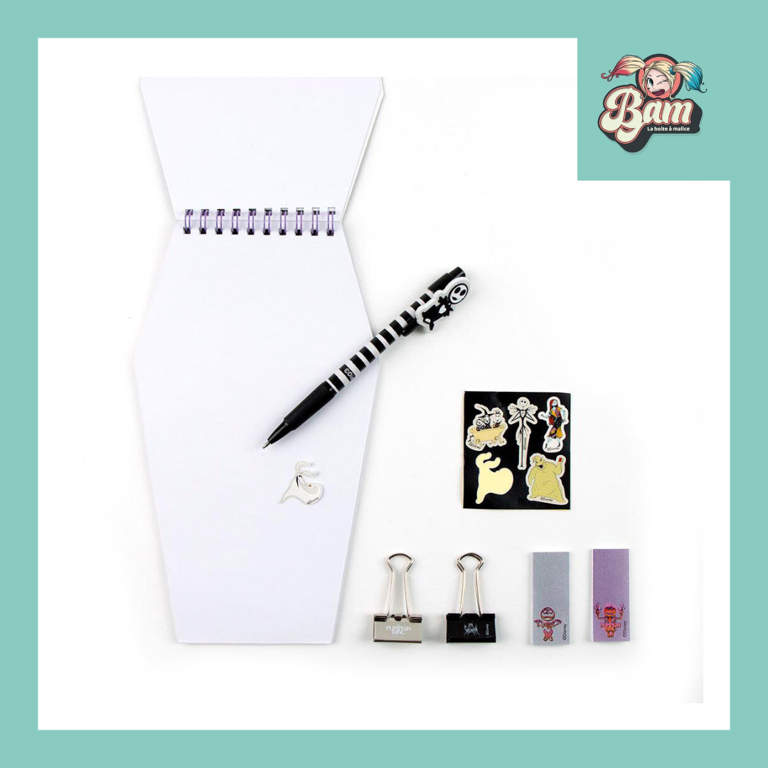 L'ETRANGE NOEL de Mr JACK - Boîte de Papeterie - 7 pièces : des stickers, 1 stylo à bille, 1 notebook, des post-it et 2 pinces double clip.