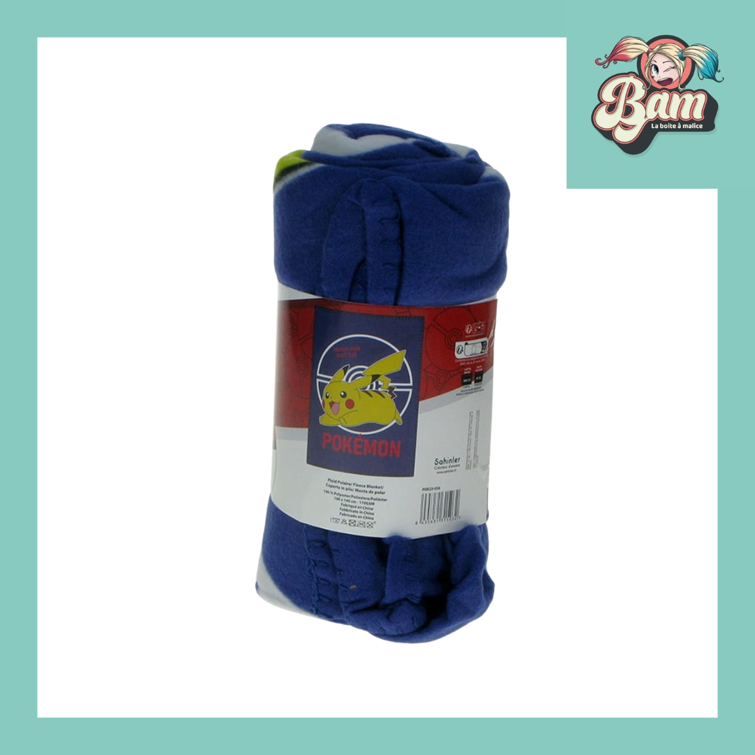 Le plaid est bleu avec la tête du plus mignon des Pokémon le bien nomé Pika.