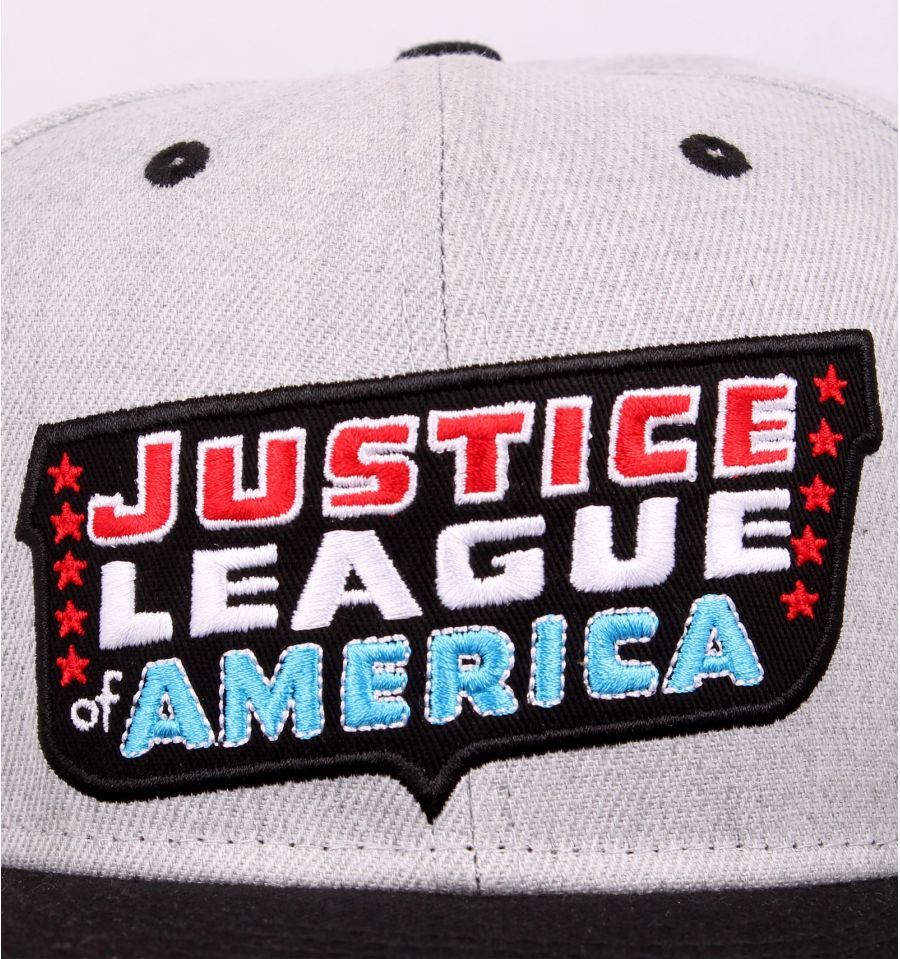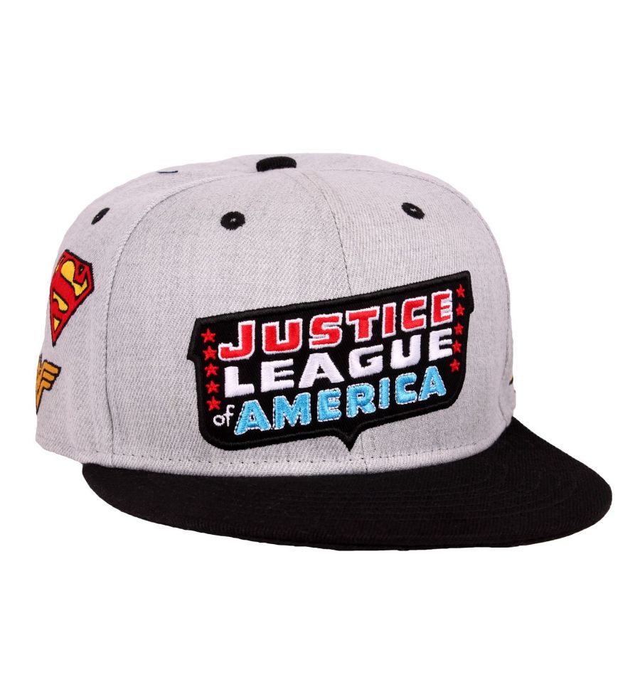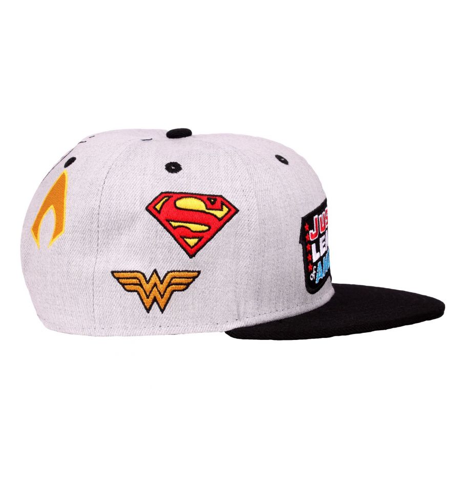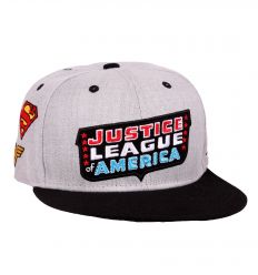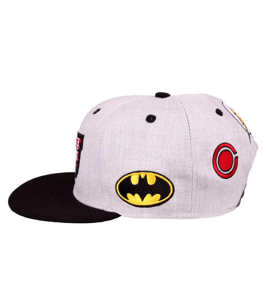 Casquette Justice League sous licence DC Comics de couleur grise. Des patch logo de tous tes Super Héros DC comics se trouvent tout autour de la casquette, Superman, wonder woman, batman ...