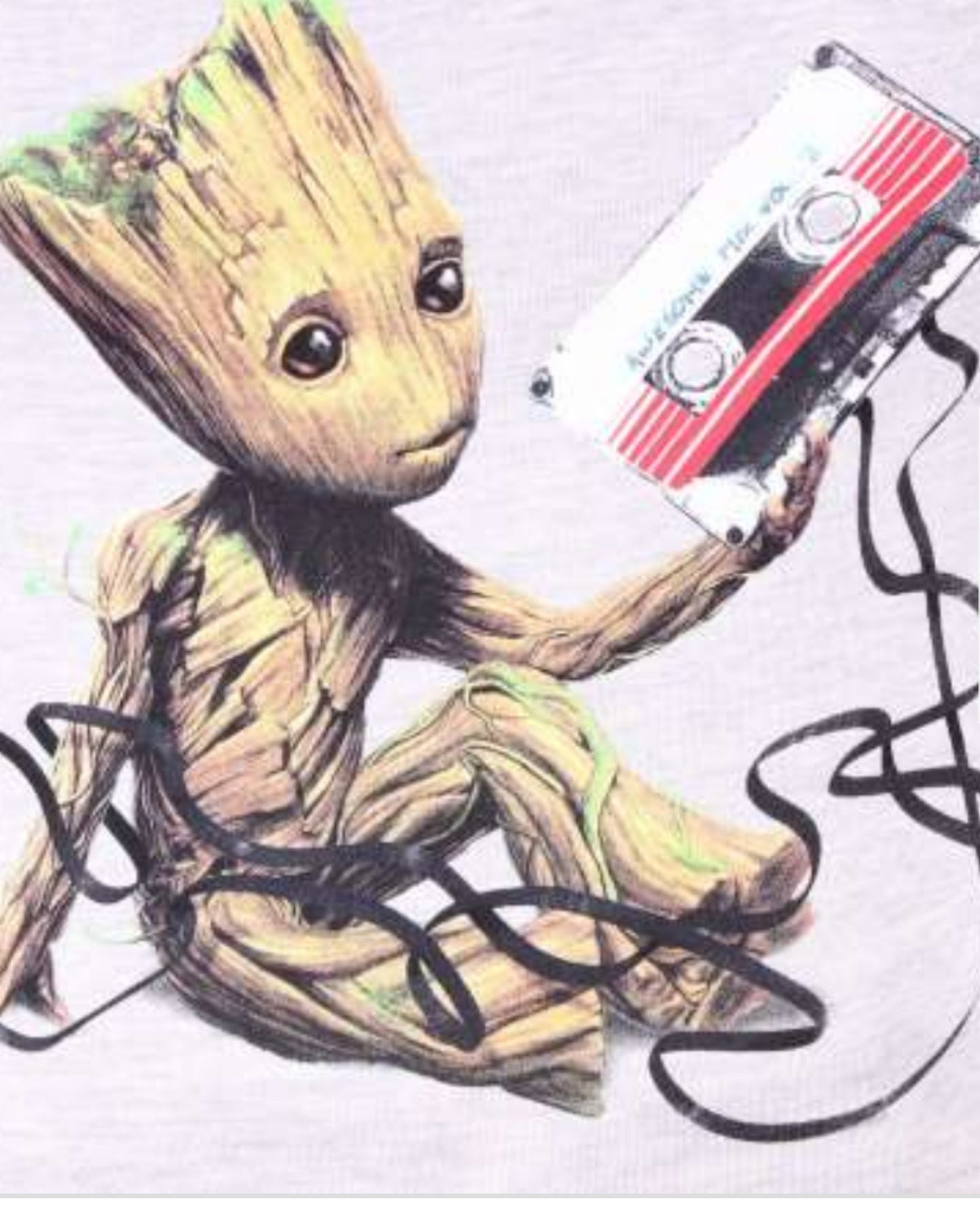 Tshirt femme à l'effigie de la célèbre brindille Groot. Baby Groot tient une cassette avec la bande déroulée, notre Groot tout mignon a encore fait des bêtises on va devoir appeler Star Lord.