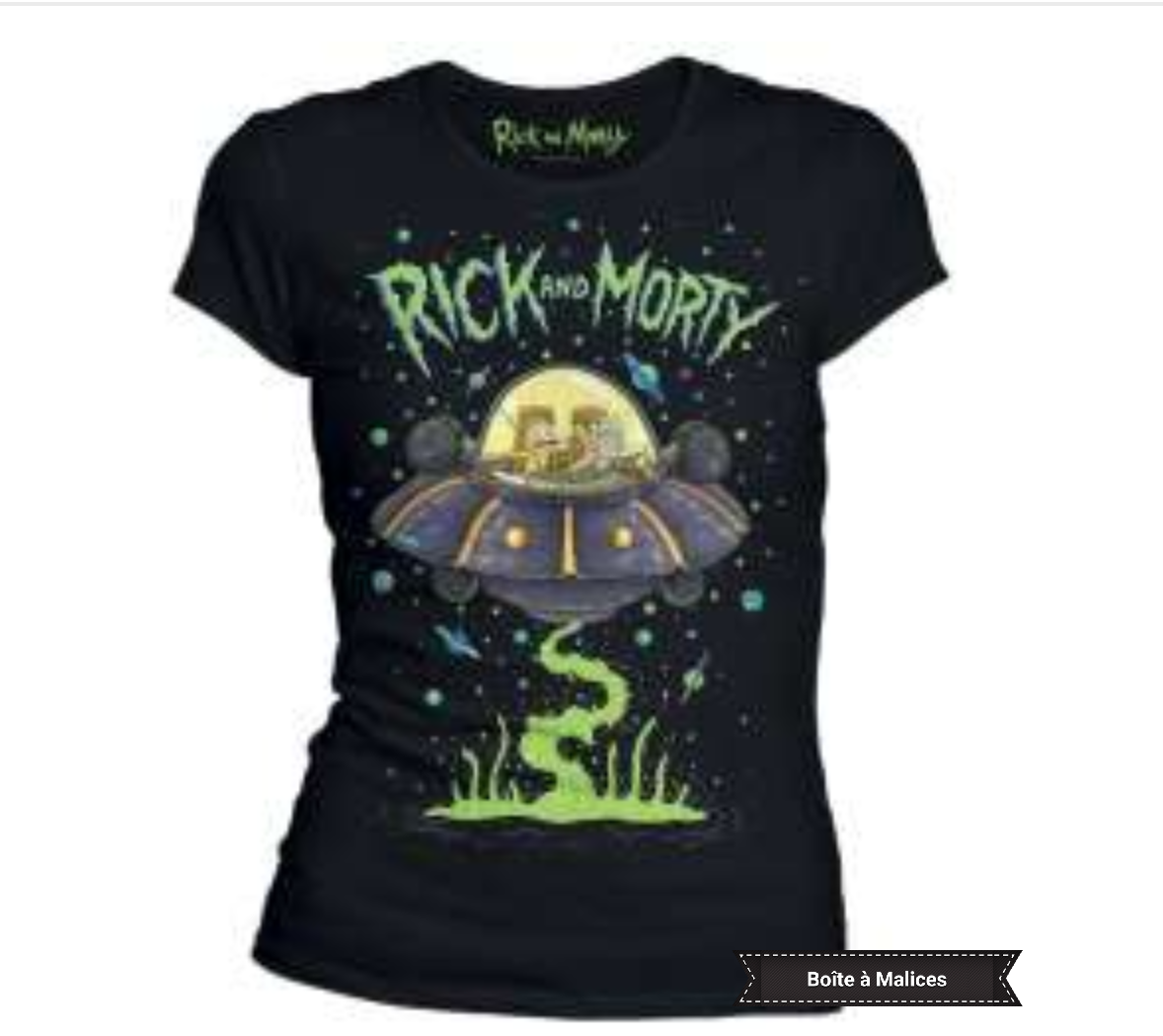 Tshirt femme Rick et Morty soucoupe volante sur fond noir.