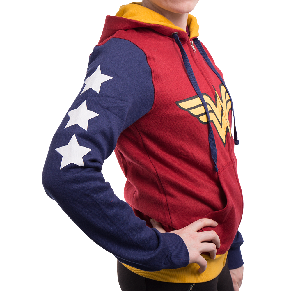 Veste rouge avec le logo W en jaune sur la poitrine. LA capuche est rouge avec l'intérieur jaune qui rappel la couleur du logo Wonde Woman. Les manches sont de couleur bleu avec 3 étoiles blanches.