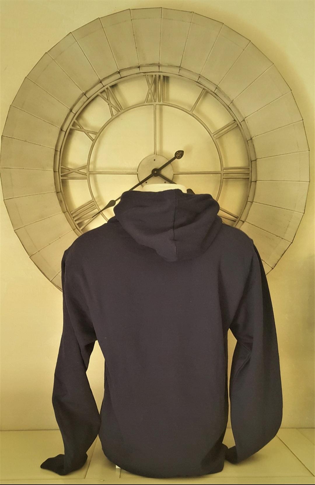Sweat col rond et manches longues avec capuche sur le torse sérigraphie du logo team cap en blanc  sur un fond bleu.