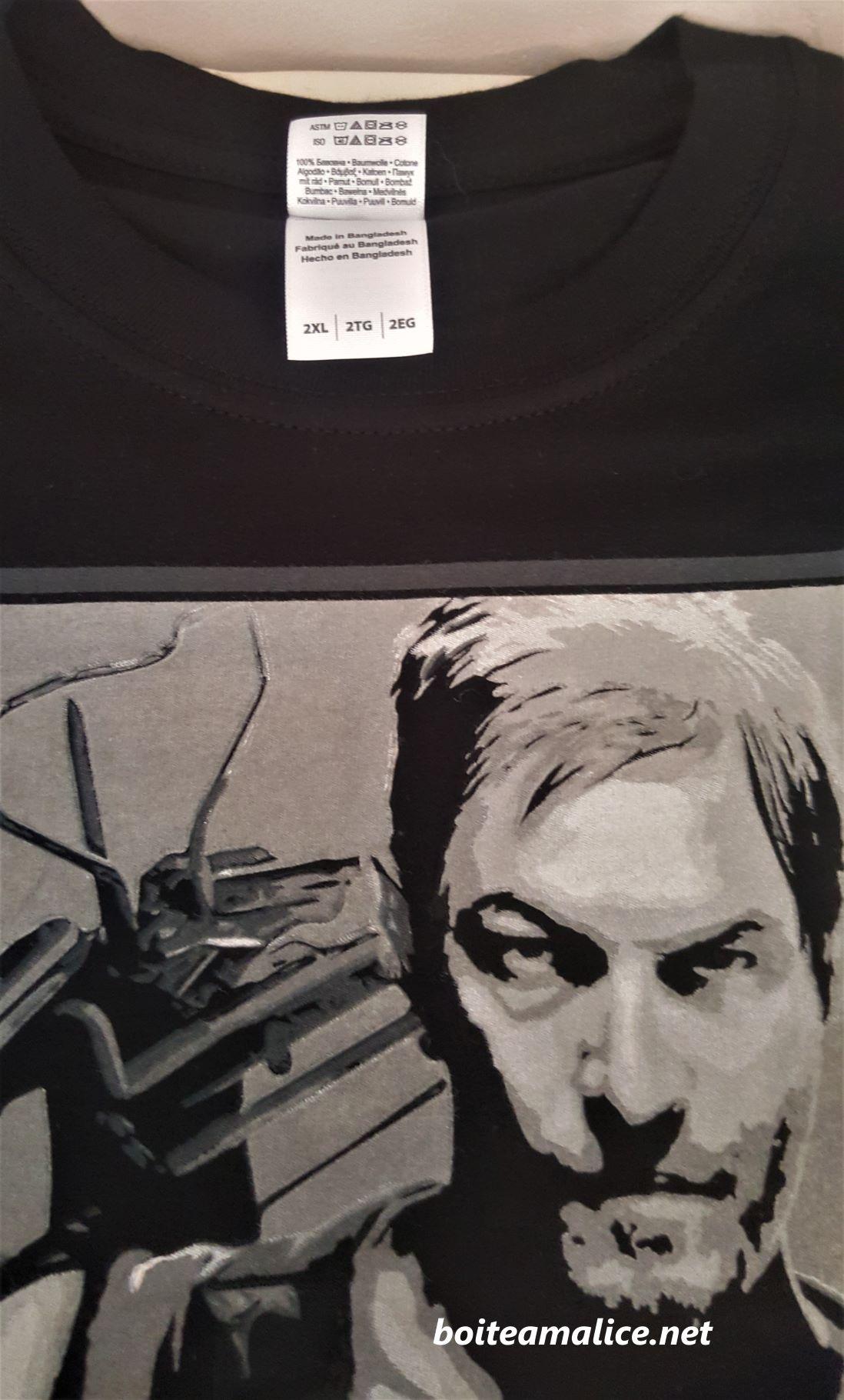 T Shirt de la série Walking Dead avec la photo de Daryl Dixon interprété par Norman Reedus qui a été créé exclusivement pour la série télévisé car il n'existe pas dans la bande dessinée originale.