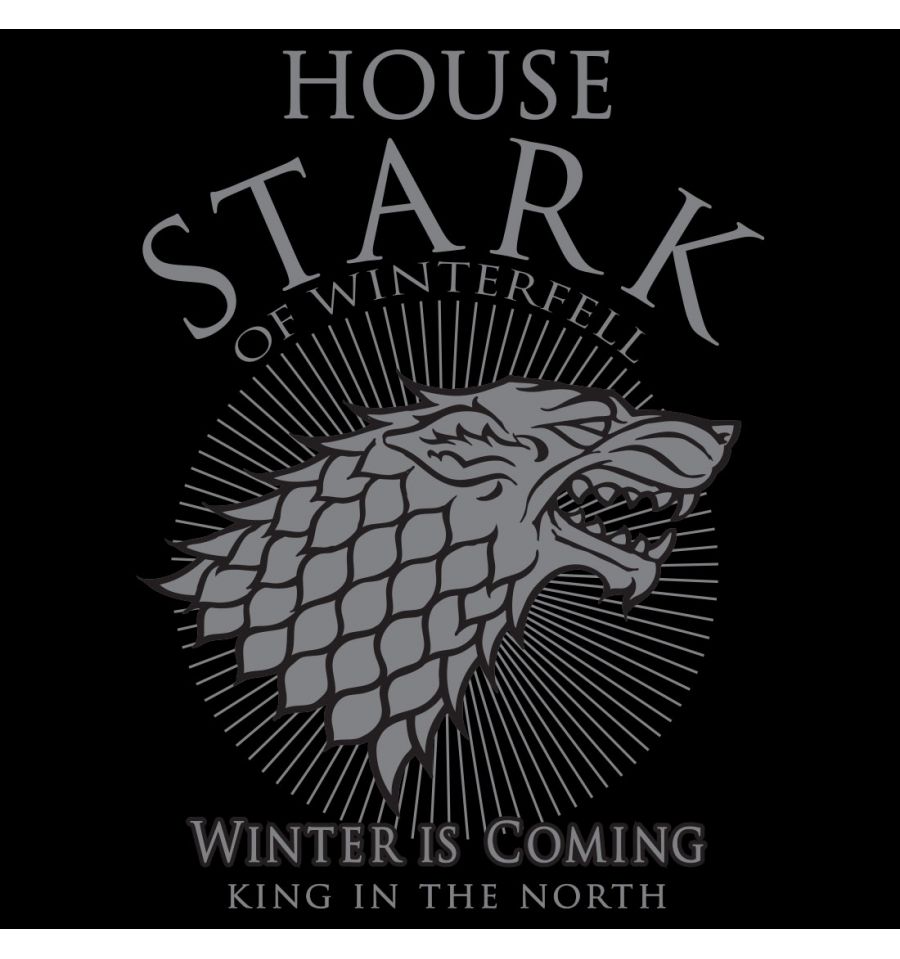 Tshirt homme Game of Thrones avec le symbole de la maison Stark le loup sur fond noir et les écritures de la célèbre réplique Winter is Comming.