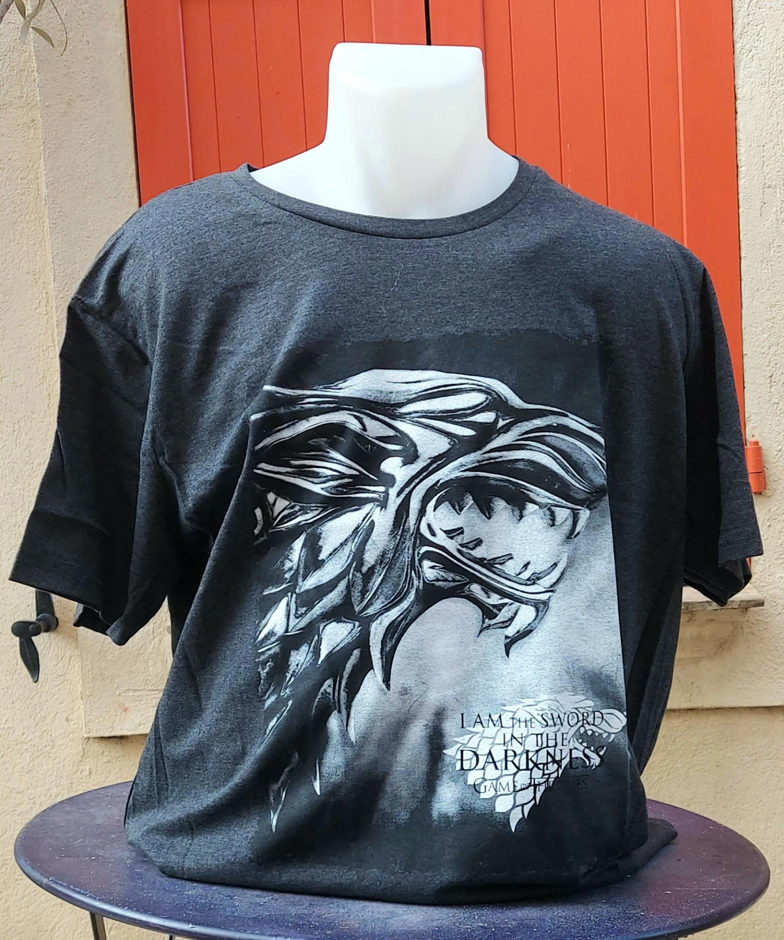 Tshirt homme Game of Thrones avec le symbole de la maison Stark le loup sur fond noir et les écritures de la célèbre réplique Winter is Comming.