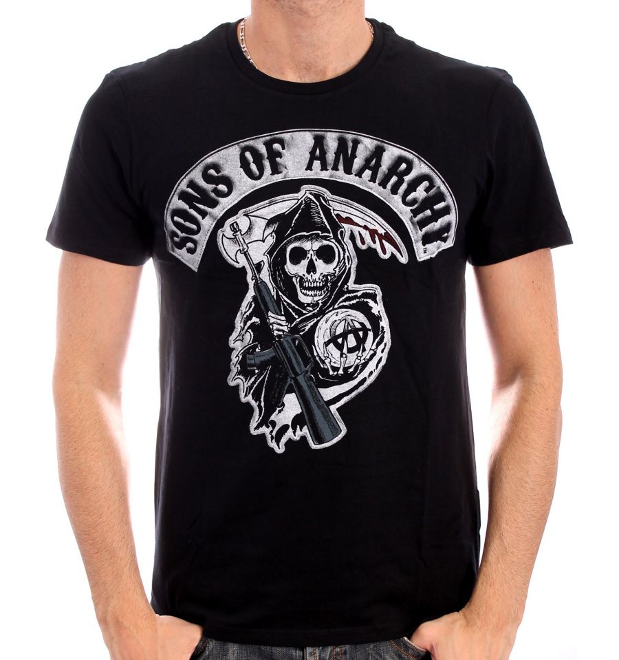 T Shirt de la série SOA, noir avec le logo du gang de motards les Sons of Anarchy. Ce logo représente une faucheuse.