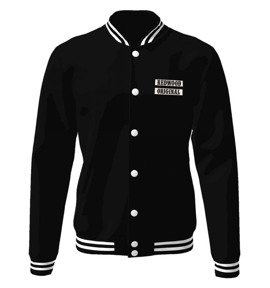 Teddie noir, sérigraphie faucheuse en blancau verso, au recto est écrit Redwood Original en noir sur fond blanc