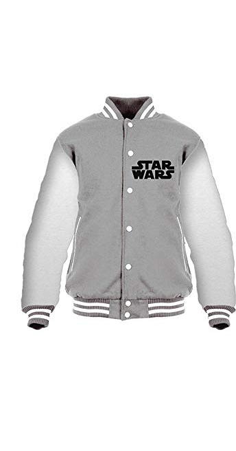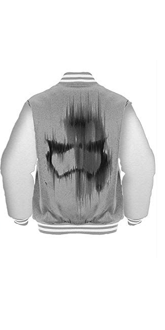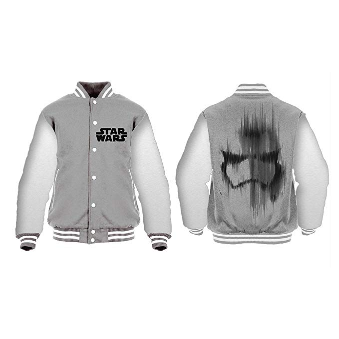 Veste Trooper grise au recto vous trouvez le logo Star Wars sur la poitrine, au dos sérigraphie en noir de la tête d'un Trooper.