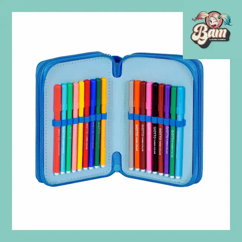 Trousse triple avec fourniture scolaire à l'intérieur : feutres, crayons de couleurs, gomme, stylo, crayon à papier, taille crayon, planneur.