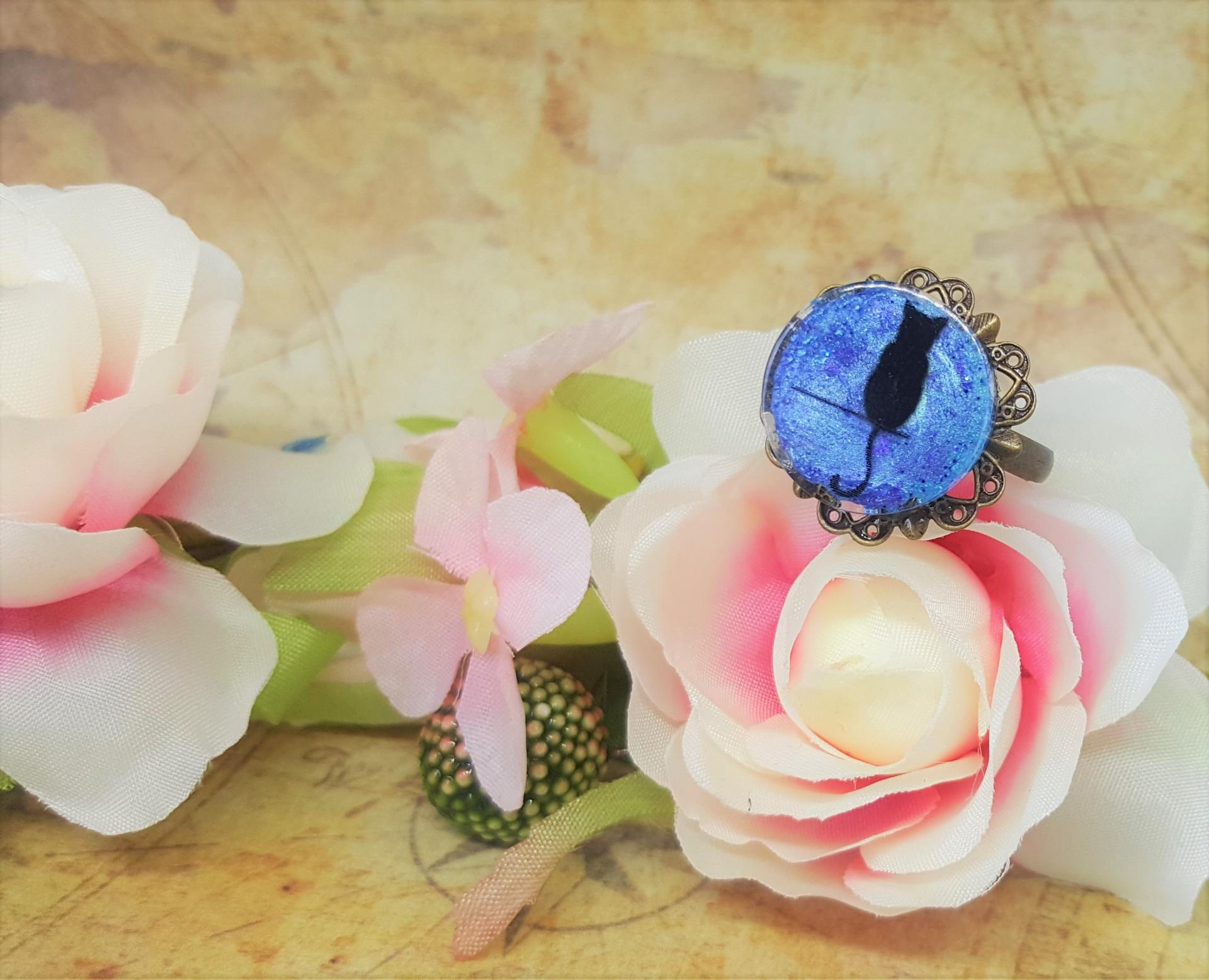 Bague réglable filigrane chat noir cabochon bleu sur bague couleur laiton