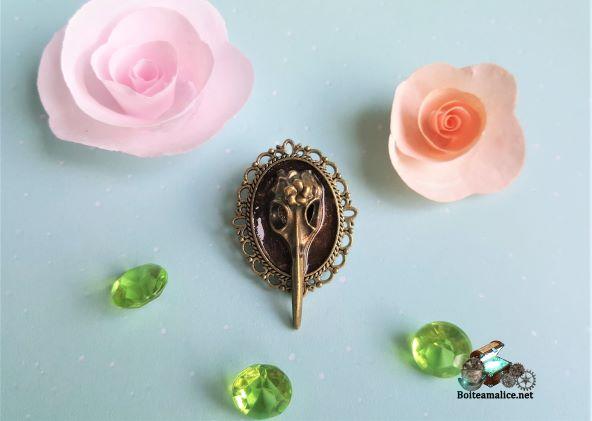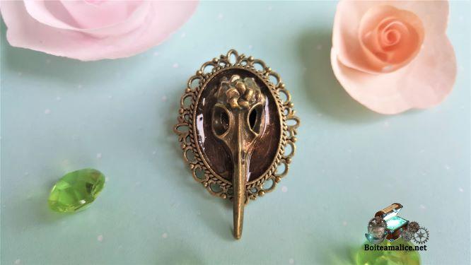 Broche avec masque oiseau couleur bronze fermé par épingle pour une tenue chic. Il ornera votre tenue steampunk avec classe, corset, jabot, chemisier.