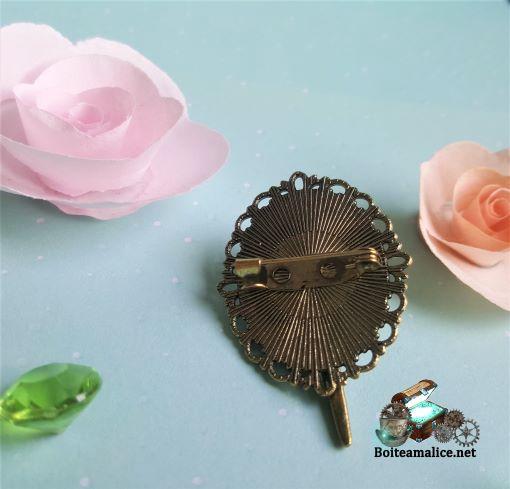 Ambiance victorienne avec ce bijou, la broche dentelle métal doré style victorien en résine couleur bronze avec incrustation crâne oiseau bronze.