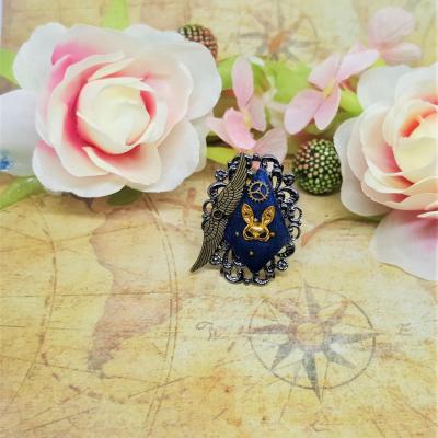 Bague réglable filigrane chat noir cabochon bleu sur bague couleur laitonBague Black Cat Bague...