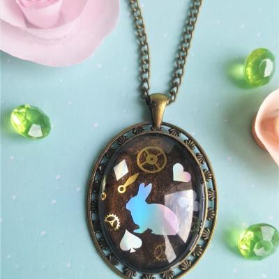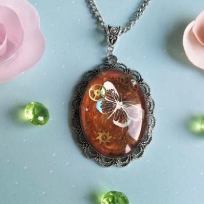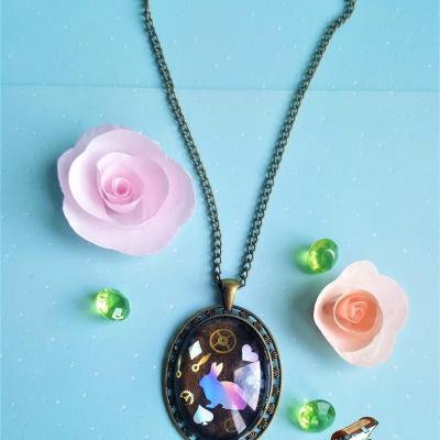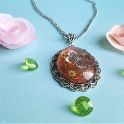 Collier engrenages FAIT MAIN Pendentif et chaîne couleur bronze Pendentif résine et cabochon en verre Collier...