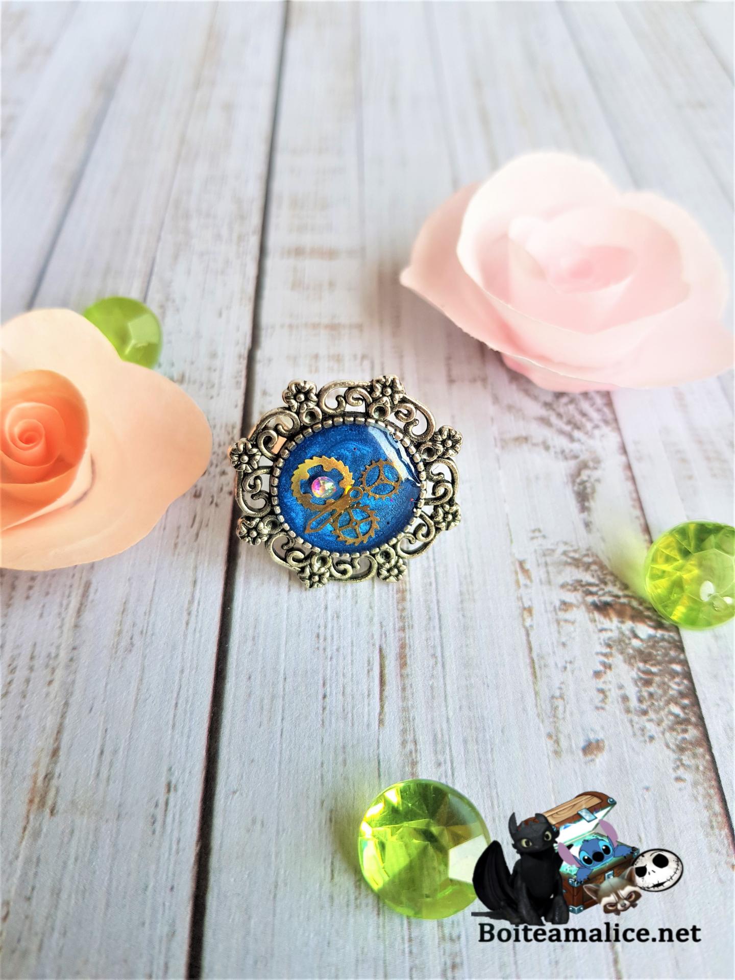 Bague réglable engrenages sur fond bleu résiné tendance steampunk avec mécanique dorée