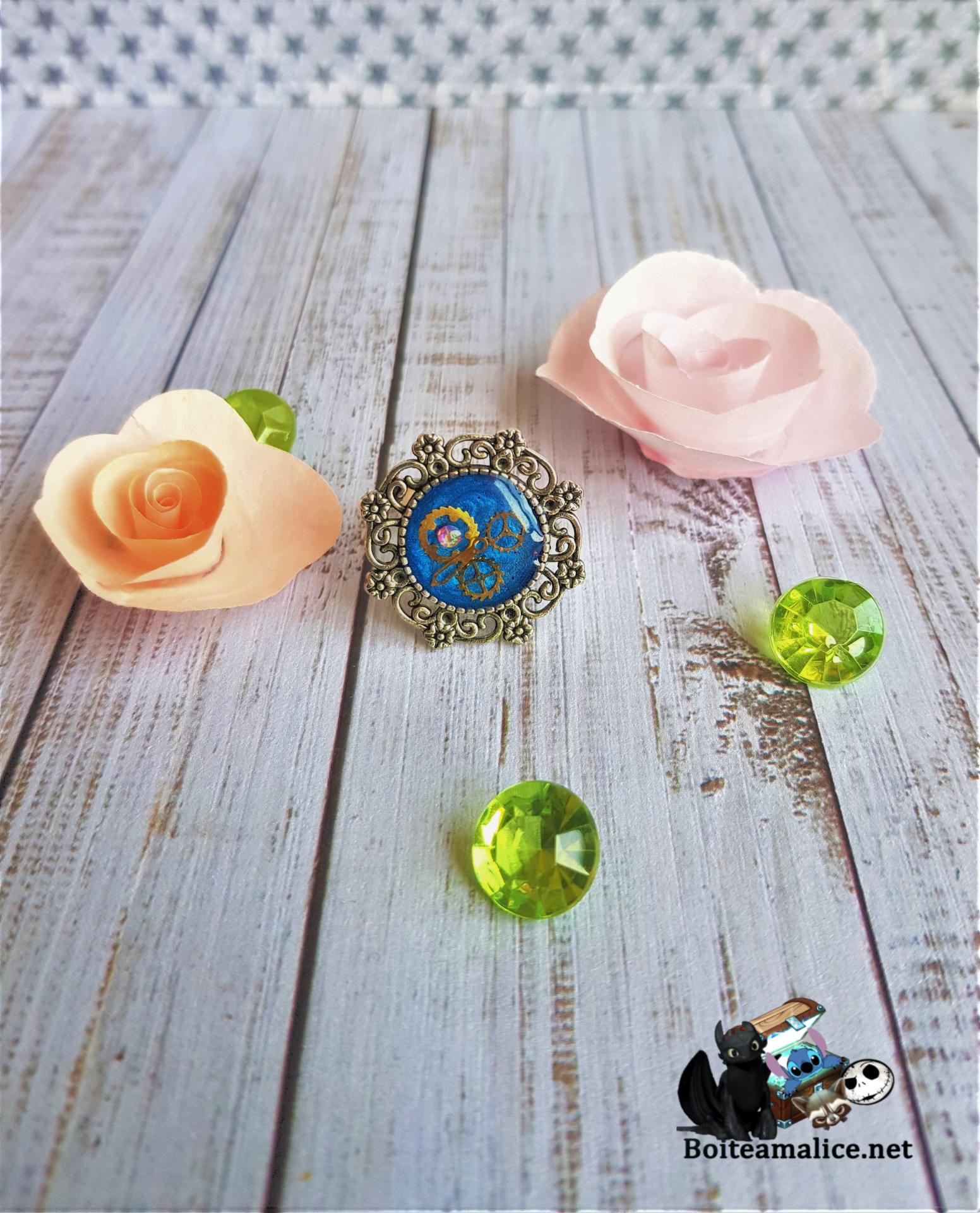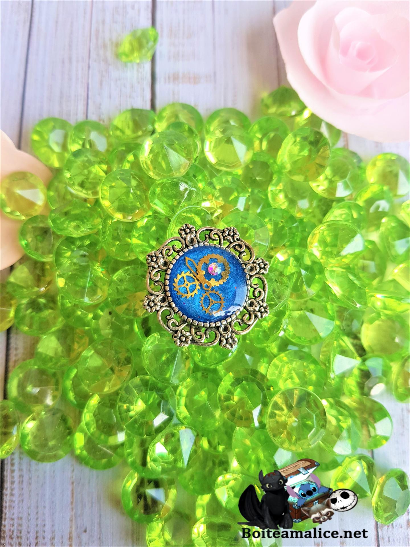 * Cabochon en résine bleue avec incrustation rouage doré et petit brillant