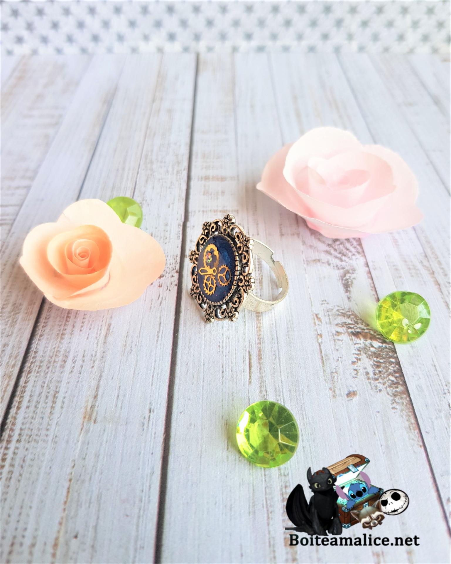 Bague réglable filigrane fleurie couleur argent avec cabochon résine mécanique horloge