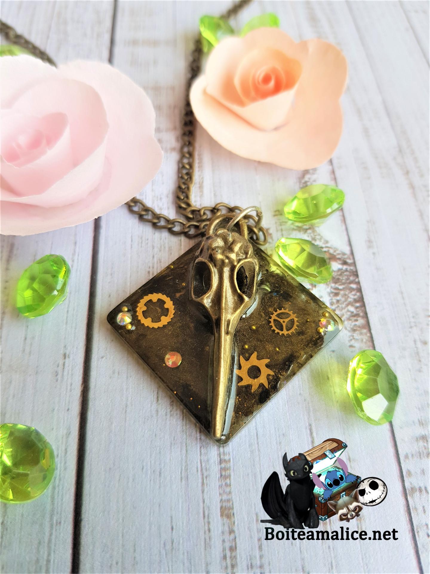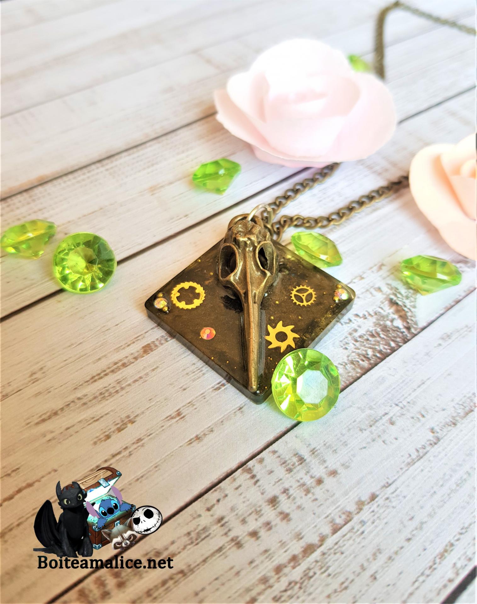 Collier steampunk crâne oiseau - corbeau FAIT MAIN - Bijou résine