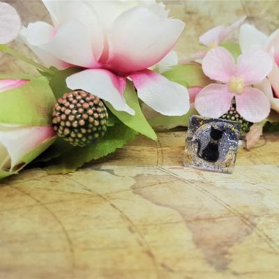 Bague réglable chat noir carré résine transparente sur bague couleur argenté alliage zinc.Bague Chat...